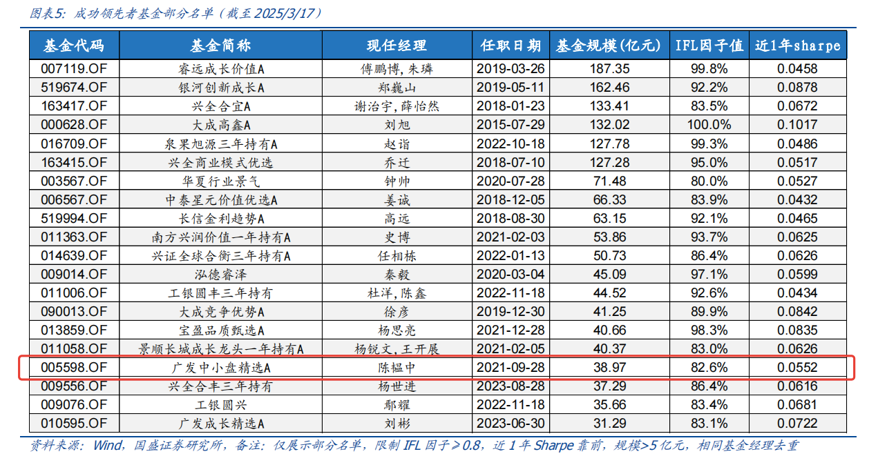今年3月,國盛證券在研報中將市場上的基金劃分為領先者、跟隨者、獨行者、潛力者。廣發(fā)中小盤精選被列入為“成功領先者”類型的基金名單。