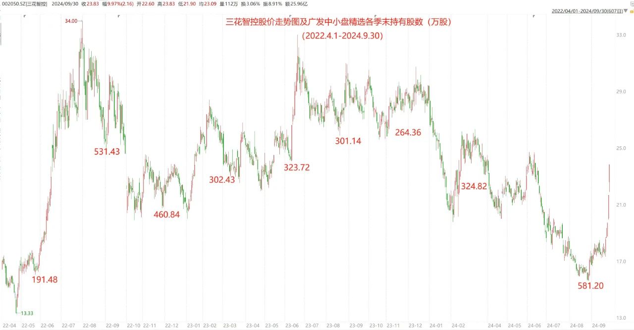 正是憑借對產(chǎn)業(yè)鏈的舉一反三和緊密跟蹤,從2022年二季度到2024年三季度的十個季度中,廣發(fā)中小盤精選有九個季度重倉三花智控。在此期間,三花智控股價累計上漲48%,其短期股價波動明顯,但陳韞中結(jié)合市場情緒和估值水平進行高拋低吸,從中獲得了不錯的收益。