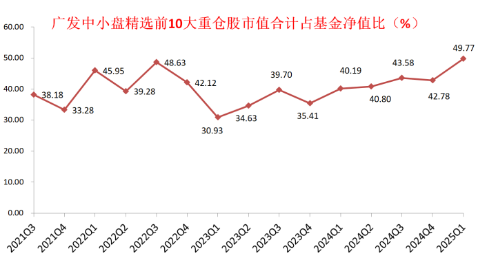 在個股集中度方面,2025年一季度末,廣發(fā)中小盤精選前十大重倉股合計占基金凈值比例為49.77%。自2021年三季度以來,廣發(fā)中小盤精選前十大重倉股占凈值比例長期保持在40%上下,與同類基金相比,集中度略低。