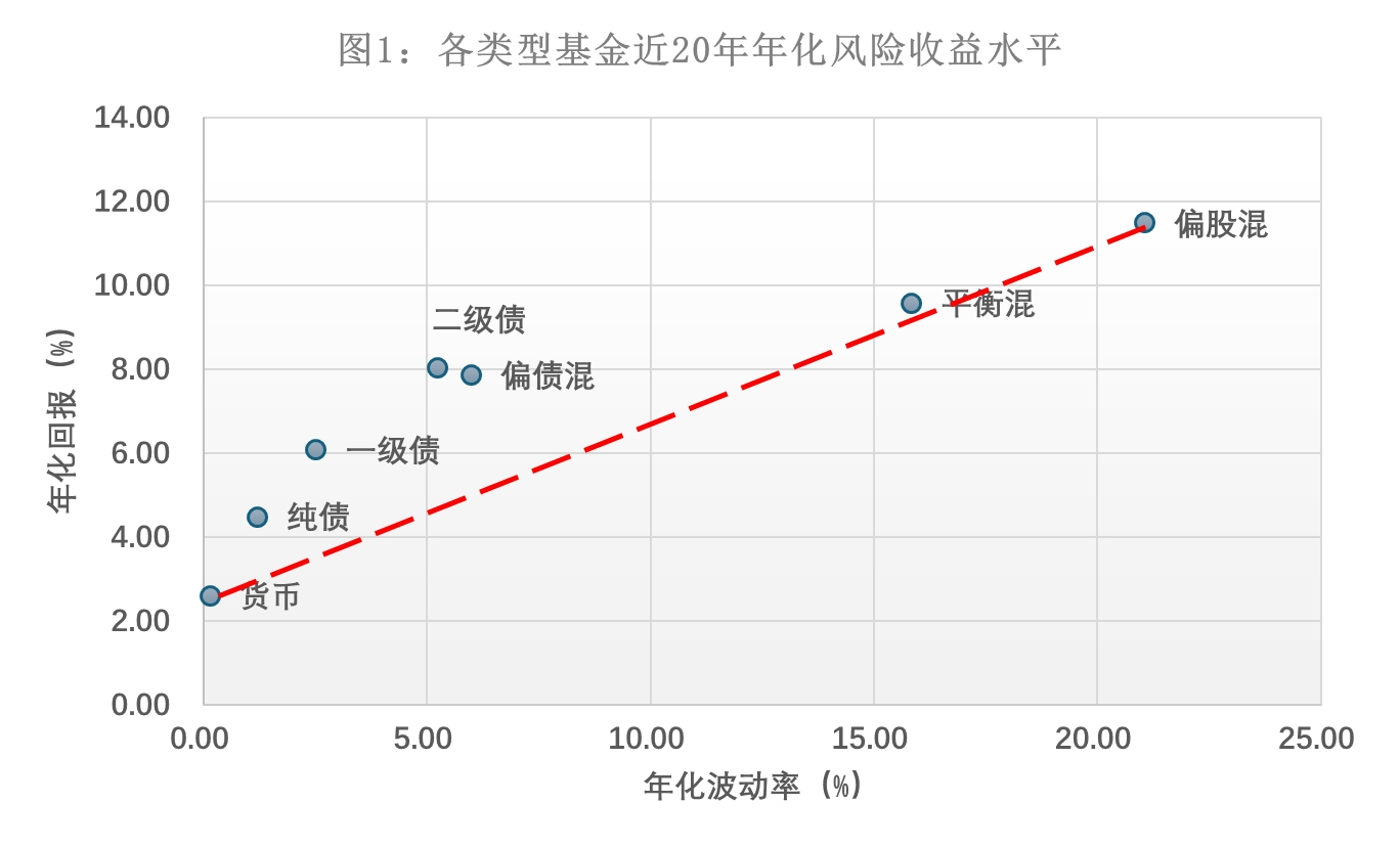 首先,我們來看看,偏債混合型基金在風(fēng)險收益坐標(biāo)系中的位置。我們統(tǒng)計了不同類別基金近20年的年化回報和年化波動率,繪圖如下: