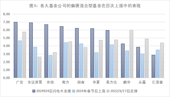 注:數(shù)據(jù)來源Wind,采用旗下偏債混合型基金(僅統(tǒng)計初始份額)的業(yè)績簡單平均。三個時間段分別為2024/9/24~2024/10/8、2024/2/6~2024/3/18、2022/4/27~2022/6/28。上述基金公司為規(guī)模TOP10基金公司,過往數(shù)據(jù)不代表未來
