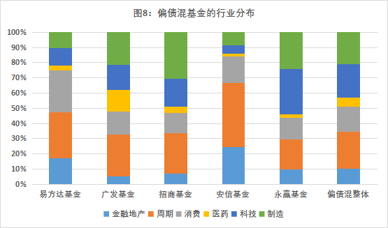從行業(yè)分布來看,相對于其他規(guī)模在同一梯隊的基金公司,廣發(fā)旗下的偏債混合型基金超配醫(yī)藥,在周期、制造板塊也有較多配置,同時明顯低配金融地產(chǎn),整體更偏向于成長進(jìn)取風(fēng)格。