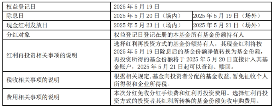 ? 除息日:場外為2025年5月19日,場內為2025年5月20日,當日基金凈值將除權除息;