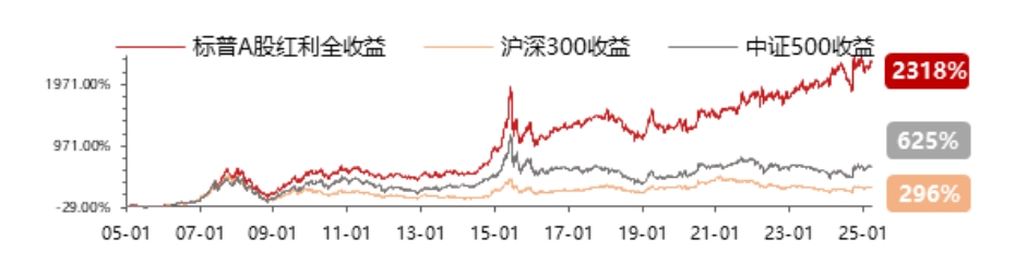 數據來源:Wind、標普道瓊斯指數公司,標的指數最新數據截至2025.3.31,統計區間:2005.1.1-2025.3.31。標普A股紅利全收益指數(將成份股分紅計入收益)近5個完整年度的漲跌幅為:2020年,6.12%;2021年,23.12%;2022年,-3.59%;2023年,14.21%;2024年,14.98%,指數歷史漲跌幅不預示其未來表現。