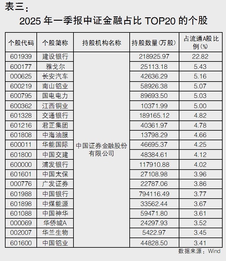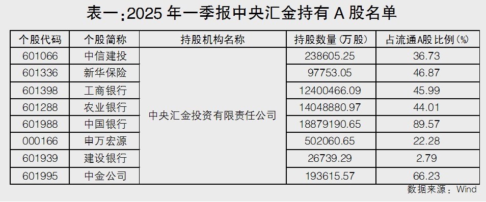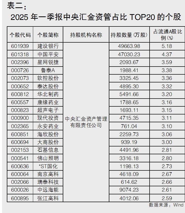 除了持有金融機構股份,中央匯金及其子公司中央匯金資產管理公司還持有大量A股資產。《大眾證券報》記者根據上市公司2025年一季報發現,中央匯金持有8家A股公司股份,分別是中信建投、新華保險、工商銀行、農業銀行、中國銀行、申萬宏源、建設銀行、中金公司,其中占比最高的是中國銀行,持有流通股比例為89.57%(見表一)。中央匯金資管持有150家A股公司股份,其中占流通股比例最高的是建設銀行,持股比例為5.18%;非金融行業中,星網銳捷、魯泰A、軟控股份、泰達股份、華北制藥、康緣藥業、超聲電子、現代投資、永安藥業、海欣股份、大商股份等持股比例均超過3%(見表二)。此外,今年剛被中央匯金控股的中證金融持有130家A股公司股份,其中占流通股比例最高的也是建設銀行,占比22.82%,雅戈爾、長安汽車、南山鋁業、國電電力、江西銅業均占比5%以上(見表三)。