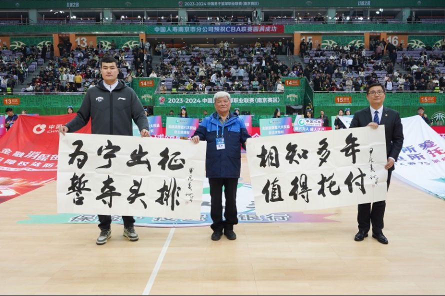 當王先生再次來到柜面辦理業務時,曾經的服務對象已化作“老朋友”。工作人員在日常交流中得知王先生全家都是南京頭排蘇酒隊的鐵桿球迷,便主動策劃跨界聯動:邀請王先生一家來到CBA中國職業籃球聯賽的比賽現場觀賽,并在中場時刻由王先生為南京頭排蘇酒隊和中國人壽壽險南京市分公司送上書法作品。“相知多年 值得托付”“為寧出征 誓奪頭排”兩幅飽含真情的作品,不僅讓王先生實現了與球員近距離接觸的心愿,更讓“國壽好服務”品牌形象深入球迷群體。