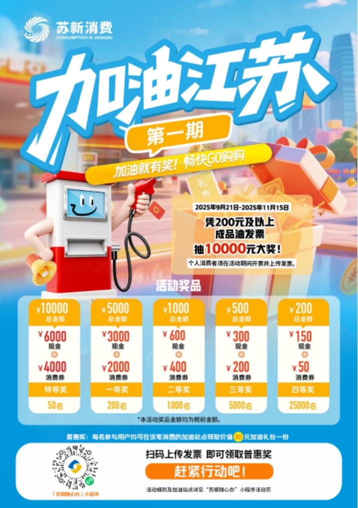 由江蘇省商務廳、省財政廳、省稅務局主辦的“加油江蘇”有獎發票活動于9月21日正式開啟,并在江蘇銀行微信小程序“蘇銀隨心辦”上線。消費者在江蘇加油超200元并開具個人發票,即可參與抽獎,獎金最高1萬元!