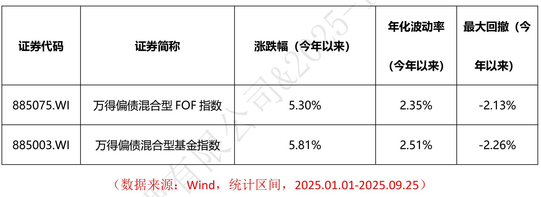 混合型FOF基金具有多元化的資產配置工具,除了固收類資產和境內外權益類資產,它還能配置商品、REITs等另類資產,更加符合當下市場需求。Wind數據顯示,今年以來,截至2025年9月25日,萬得偏債混合型FOF指數漲跌幅達5.30%,年化波動率僅2.35%,最大回撤控制在- 2.13%;同期萬得偏債混合型基金指數漲跌幅5.81%,但年化波動率升至2.51%,最大回撤擴大至- 2.26%。這意味著偏債混合型FOF在收益接近偏債基金的同時,展現出更優的抗波動屬性,風險收益比優勢顯著。