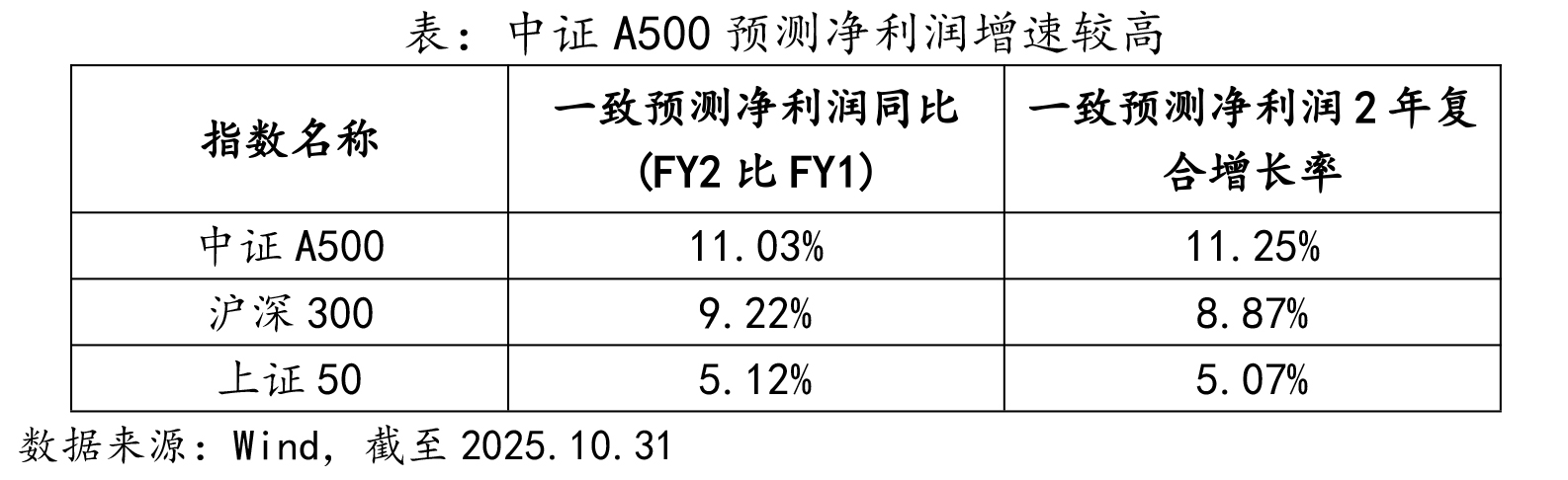 根據(jù)Wind給出的盈利預(yù)測,截至10月底,中證A500指數(shù)成份股的凈利潤同比(FY2比FY1)增速為11.03%、凈利潤2年復(fù)合增長率為11.25%,這兩組數(shù)據(jù)均優(yōu)于同期滬深300和上證50,證明成份股在未來依然具備較好的增長質(zhì)量。