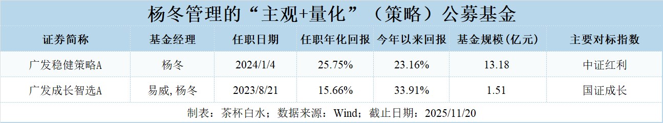 具體來看,楊冬管理的策略類產(chǎn)品包括廣發(fā)穩(wěn)健策略(006780)和廣發(fā)成長智選(002802),業(yè)績基準分別主要對標中證紅利和國證1000成長指數(shù)。