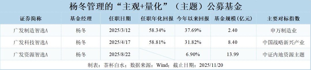 對于主題增強類產(chǎn)品而言,楊冬團隊在今年陸續(xù)發(fā)行了制造智選、科技智選和資源智選三只“智選”系列產(chǎn)品,分別對標申萬制造指數(shù)、中證新興成指和內(nèi)地資源指數(shù)。