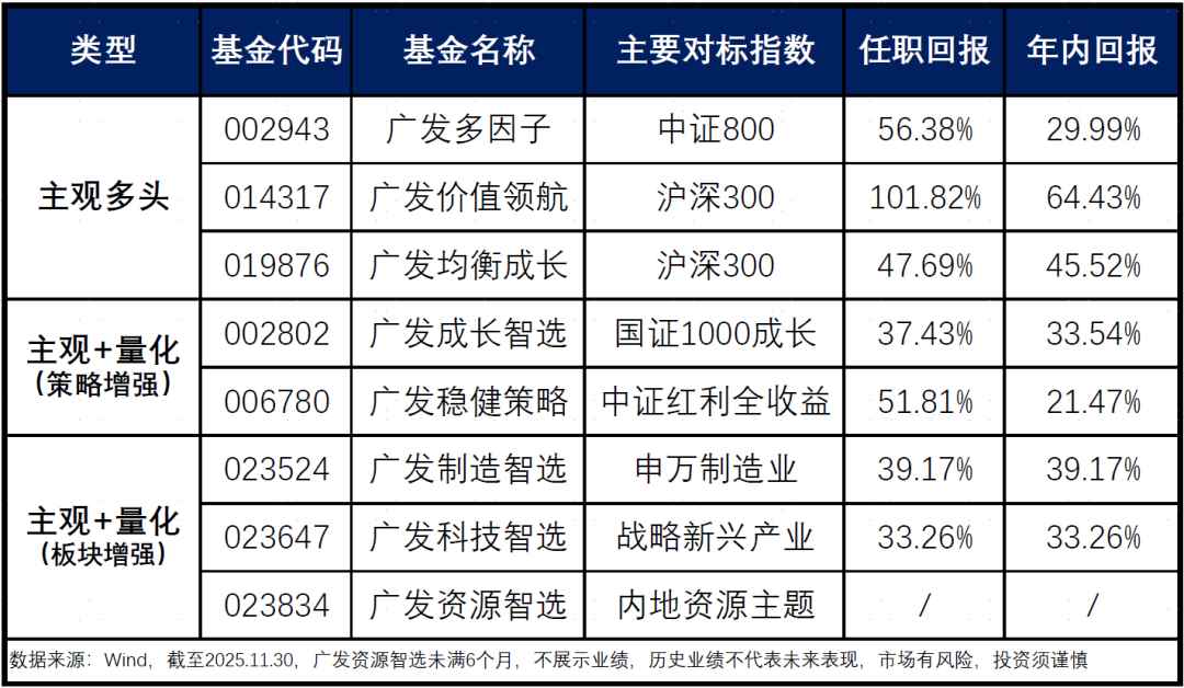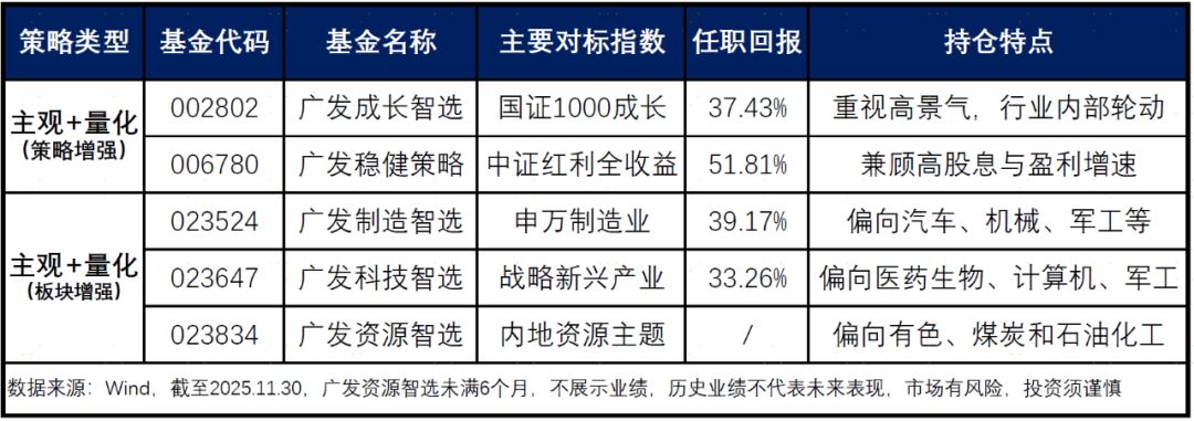 廣發資源智選(023834)、廣發科技智選(023647)、廣發制造智選(023524)均為2025年內新發的主題增強型產品,均采用“主觀多頭+主動量化+AI增強”的復合策略。