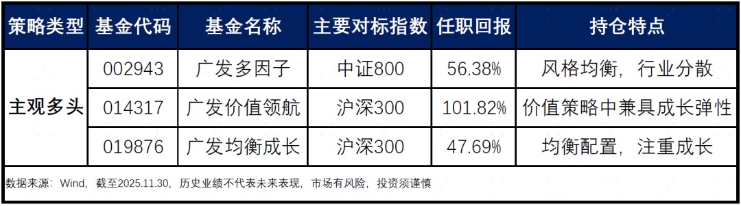 除了廣發多因子,團隊旗下的底倉型產品還有廣發價值領航一年(014317)與廣發均衡成長(019876),這兩只產品自成立以來的累計收益分別達到101.82%和47.69%,年化收益率均達到20%以上(數據來源:Wind,截至2025.11.30)。