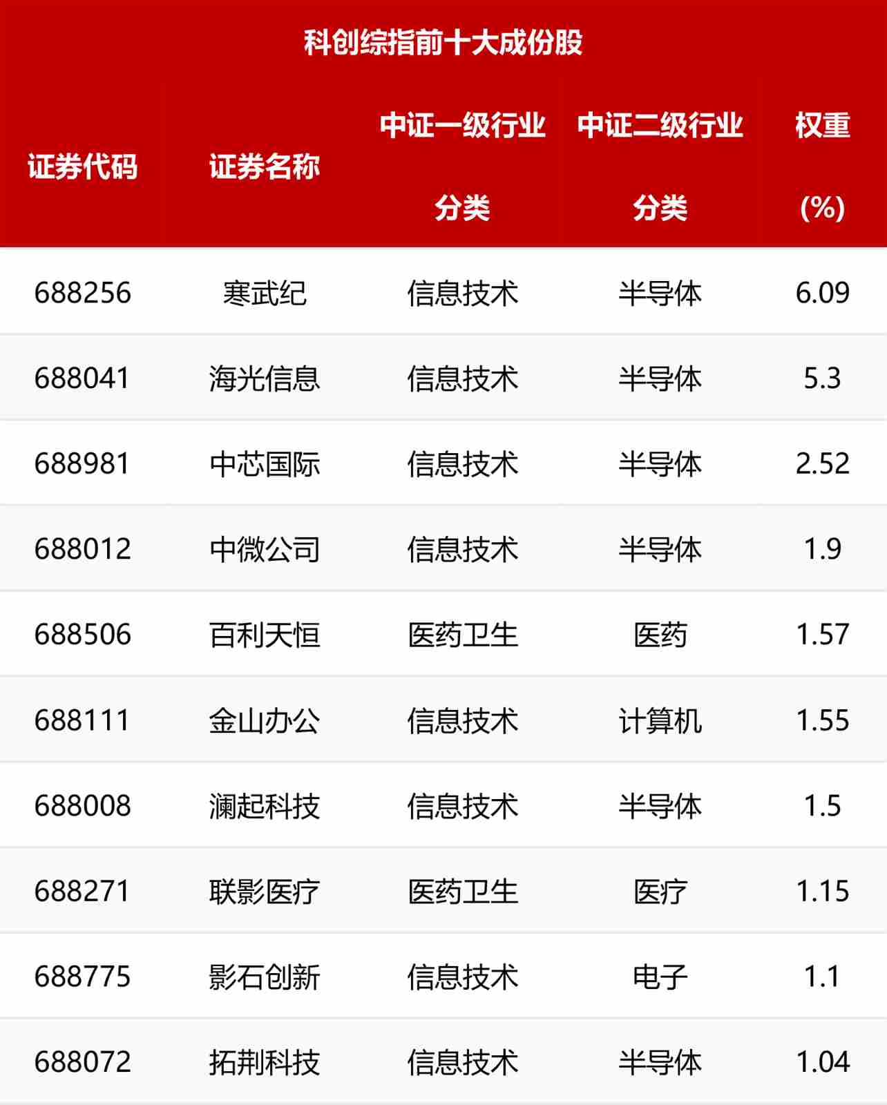 在行業與成分股結構上,指數科創濃度高,覆蓋超過500只成分股,包含大、中、小盤,采用總市值加權,堪稱“科創板500強”的集中代表,為投資者提供了一鍵配置科創板企業的便捷工具;其前十大成分股權重合計為23.59%,集中度相對較低。