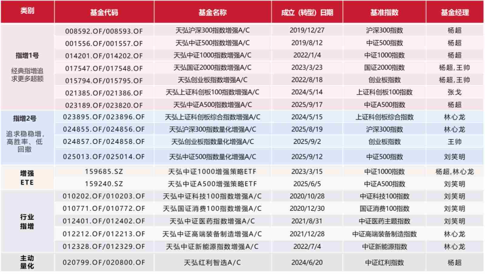 此外,天弘基金還在2021年末場內指數增強ETF興起之際,推出了天弘中證1000增強策略ETF等場內工具。指數增強ETF兼顧了ETF交易便捷、透明度高、成本較低的優勢與指數增強策略獲取超額收益的潛力,也是產品生態中“場內外聯動”的重要一環。