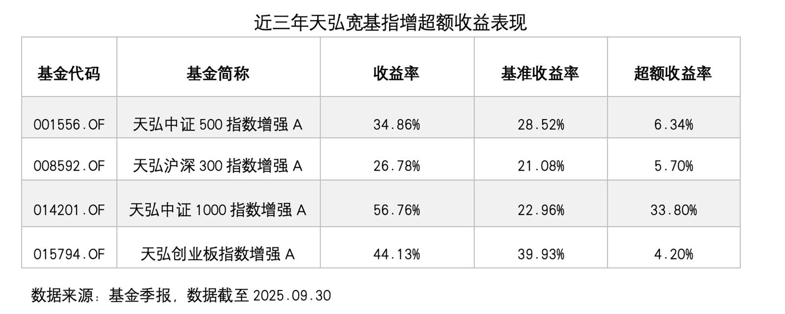 截至12月2日,天弘基金旗下共有四只寬基指數增強產品運作滿三年。2022年初成立的中證1000指增表現尤為突出,根據基金定期報告,截至2025年三季度末,近三年基金相對業績比較基準(中證1000指數收益率×95%+銀行活期存款利率(稅后)×5%)超額達到33.80%。