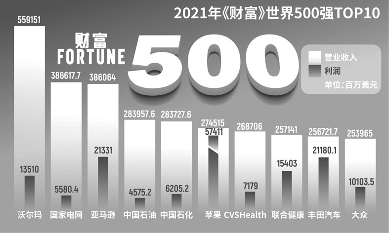 本報綜合消息8月2日,2021年 《財富》世界500強(qiáng)排行榜公布。今年,沃爾瑪連續(xù)第八年成為全球最大公司,中國的國家電網(wǎng)公司上升至第二位,亞馬遜首次進(jìn)入前三,蘋果公司前進(jìn)至第6位。
