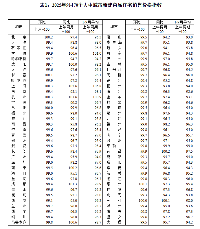 2025年9月份,70個大中城市中,各線城市商品住宅銷售價格環比下降,同比降幅繼續呈收窄態勢。