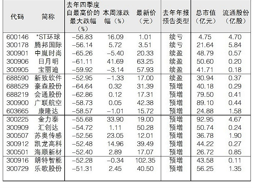 本周以來(lái)超跌股表現(xiàn)搶眼,比如正丹股份、日月明、金力泰等周漲幅均超過(guò)了30%。據(jù)Wind數(shù)據(jù)統(tǒng)計(jì),去年四季度自最高價(jià)的最大跌幅超過(guò)50%的個(gè)股共計(jì)有207只,這其中已經(jīng)預(yù)告去年年報(bào)業(yè)績(jī)向好的超跌股共計(jì)有35只。