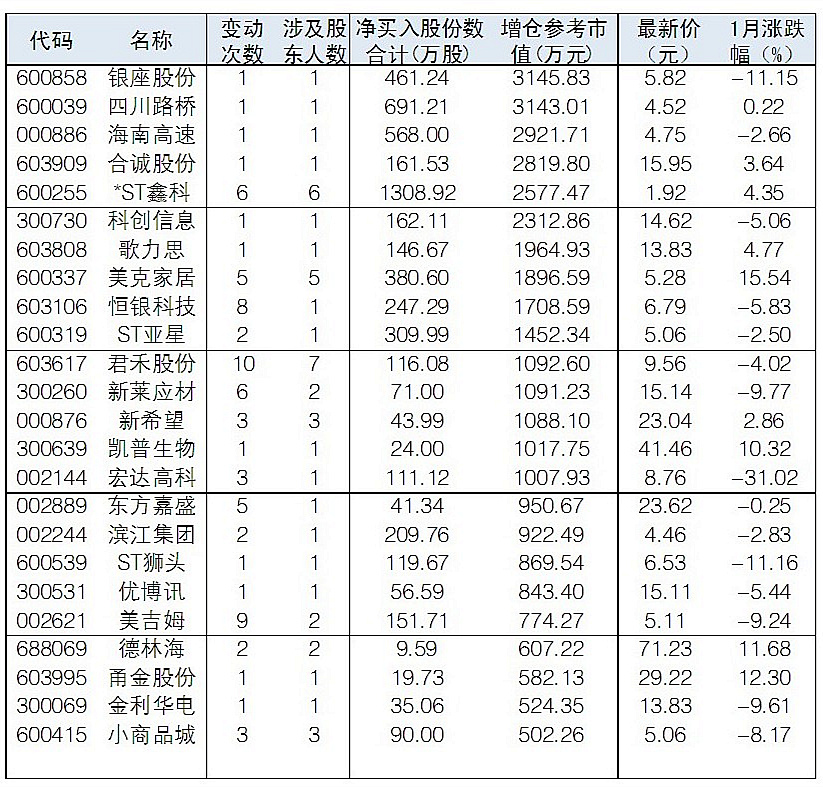 據Wind數據統計,1月以來共計有110家公司被重要股東在二級市場上凈增持,其中有40股被增持凈額超過1000萬元。其中,寧波港、南京銀行、萬興科技、現代投資等被凈增持金額居前。