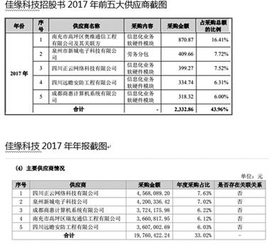 根據招股書,佳緣科技2017年第三大供應商為四川正云網絡科技有限公司,公司向其采購信息化業務軟硬件模塊,采購金額為399.27萬元,占采購總額的比例為7.52%。而佳緣科技掛牌期間的2017年年報顯示,四川正云網絡科技有限公司為其當年第一大供應商,佳緣科技向其采購金額為456.81萬元,兩者金額相差了57萬多元,在供應商名單上的座次也相去甚遠。