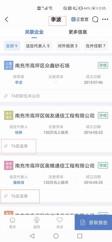 企查查顯示,未存在于佳緣科技2017年年報供應商名單上,但招股書中卻“突然”位列2017年第一大供應商名單的南充市高坪區奧維通信工程有限公司及其關聯方,和位列2017年年報第四大供應商,但卻從招股書2017年前五大供應商名單上“消失”的南充市高坪區瑞友通信工程有限公司,不僅兩家企業的業務范圍相似,地理位置相鄰——同屬于南充市高坪區,而且分別成立于2016年5月25日和2016年5月23日,成立時間僅相差兩天。此外,值得注意的是,南充市高坪區奧維通信工程有限公司的監事李波同樣也在南充市高坪區瑞友通信工程有限公司擔任監事(見圖二)。