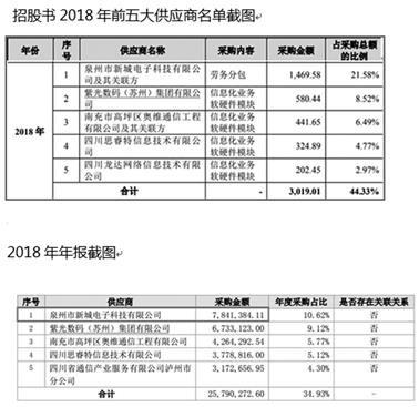招股書顯示,佳緣科技2018年向四川思睿特信息技術有限公司采購324.89萬元,2018年年報則是采購377.88萬元,兩者金額相差53萬元左右。還有,招股書中,公司2018年向紫光數碼(蘇州)集團有限公司采購580.44萬元,而年報中則是采購673.31萬元,兩者金額相差接近93萬元。