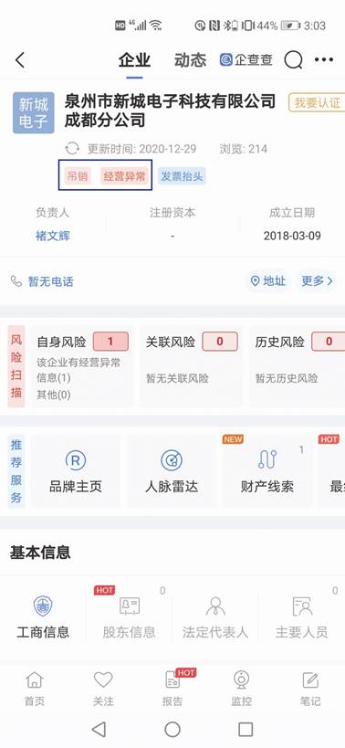 更值得一提的是,企查查顯示,泉州市新城電子科技有限公司成都分公司,存在2019年被列入經營異常名錄的經營異常信息,即未按照規定向當地市場監督機構提交年度報告;此后的2020年6月25日,該企業被吊銷(見圖四)。