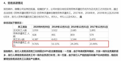 對(duì)于超比例違規(guī)使用勞務(wù)派遣員工,和輝光電招股書(shū)中如是解釋?zhuān)骸皥?bào)告期內(nèi),發(fā)行人勞務(wù)派遣用工比例超過(guò)10%的主要原因是:一方面,由于年底或新年期間,大量一線作業(yè)員離職返鄉(xiāng),發(fā)行人使用勞務(wù)派遣員工對(duì)一線作業(yè)員進(jìn)行補(bǔ)充;另一方面,由于發(fā)行人產(chǎn)能的提升和客戶(hù)需求的增加,相應(yīng)需要增加勞務(wù)派遣員工以滿(mǎn)足產(chǎn)出要求。”