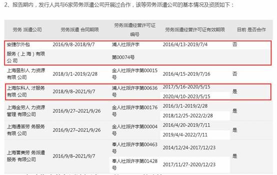 和輝光電在對(duì)第二輪審核問(wèn)詢(xún)函的回復(fù)中,披露了報(bào)告期內(nèi)曾與6家勞務(wù)派遣公司開(kāi)展過(guò)合作,其中包括安捷爾外包服務(wù)(上海)有限公司、上海東科人才服務(wù)有限公司(見(jiàn)圖二)。