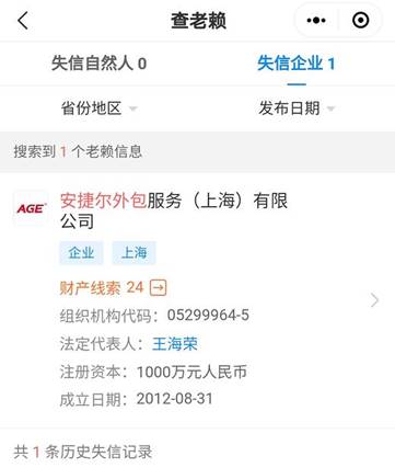 這意味著,安捷爾外包服務(wù)(上海)有限公司曾是人們俗稱(chēng)的“老賴(lài)”企業(yè)。