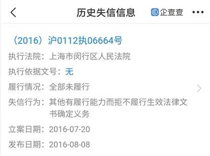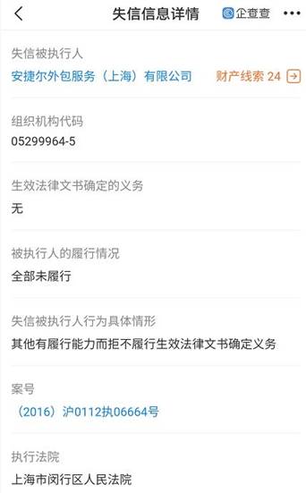 企查查顯示,成立于2012年的安捷爾外包服務(wù)(上海)有限公司持股50%的股東為劉建華并擔(dān)任總經(jīng)理,王海榮為法定代表人和執(zhí)行董事、監(jiān)事,該企業(yè)自身有失信被執(zhí)行信息,案號(hào)為(2016)滬0112執(zhí)06664號(hào),系上海市閔行區(qū)人民法院于2016年7月20日立案執(zhí)行,該失信信息發(fā)布時(shí)間為2016年8月8日(見(jiàn)圖三、圖四、圖五)。