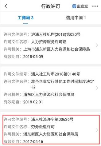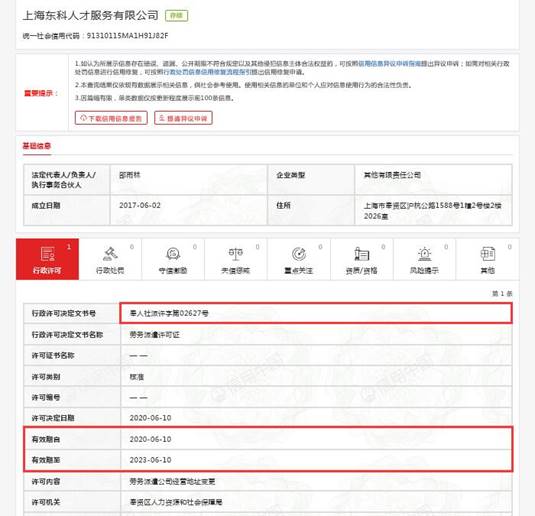 2、公司在二次審核問(wèn)詢(xún)回復(fù)函中所稱(chēng)上海東科人才服務(wù)有限公司浦人社派許字第00636號(hào)的有效期是2017年5月16日至2020年5月15日、2020年4月10日至2023年5月15日,為何與通過(guò)企查查、信用中國(guó)查詢(xún)顯示的信息不一致?公司所稱(chēng)是否與事實(shí)不符,甚至存在虛假陳述?