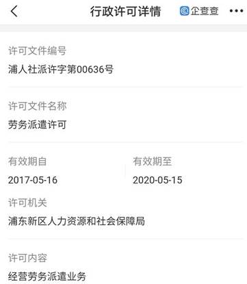 但是,企查查顯示,上海東科人才服務(wù)有限公司(統(tǒng)一社會(huì)信用代碼91310115MA1H91J82F)的行政許可中,編號(hào)為浦人社派許字第00636號(hào)的勞務(wù)派遣經(jīng)營(yíng)許可證,有效期期限只到2020年5月15日(見(jiàn)圖六、圖七)。