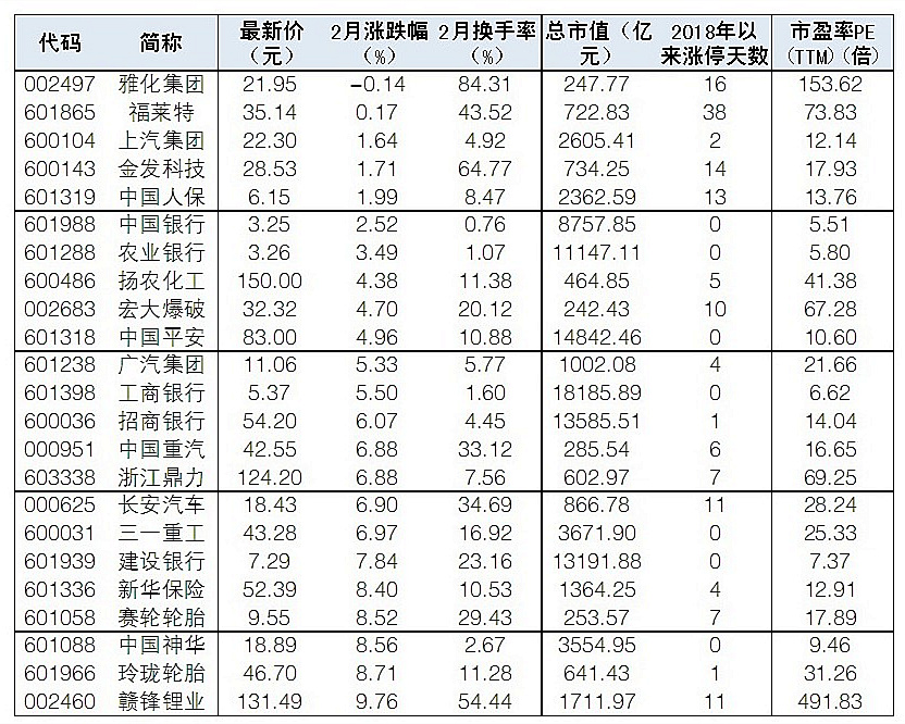 節(jié)后順周期板塊持續(xù)走強(qiáng)。根據(jù)Wind數(shù)據(jù)統(tǒng)計(jì),2月順周期個(gè)股中,江西銅業(yè)、西部礦業(yè)累計(jì)漲幅已經(jīng)超過(guò)50%。此外,盛和資源、恒逸石化、魯西化工累計(jì)漲幅亦超過(guò)40%。截至昨日,目前仍有46只順周期股2月漲幅小于10%。