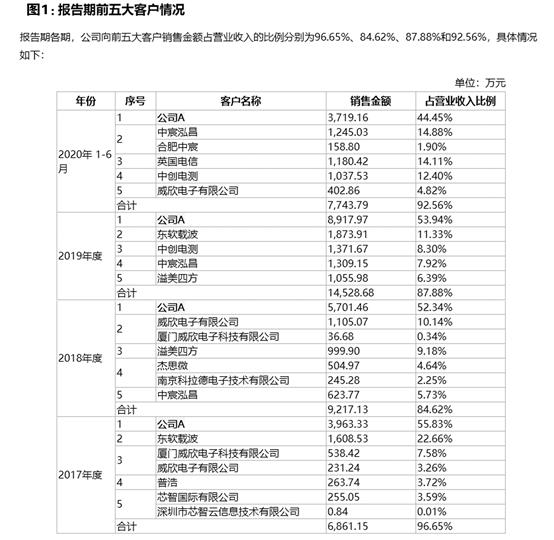2017年至2020年上半年,創耀科技向前五大客戶銷售收入合計占營業收入的比例分別為96.65%、84.62%、87.88%和92.56%,集中度非常高。