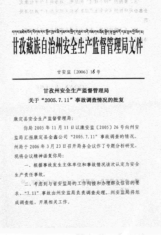 圖二 《甘孜州安全生產監督管理局關于“2005.7.11”事故調查情況的批復》