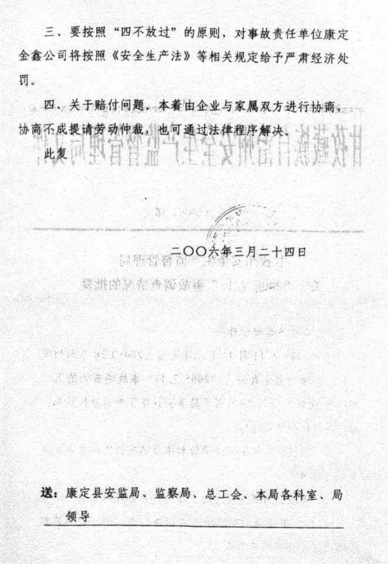 上述舉報人表示:“此次事故被甘孜州安監局以《甘安監字(2006)第16號》文件,即《甘孜州安全生產監督管理局關于‘2005·7·11’事故調查情況的批復》依法認定為:安全生產責任事故”(圖二),而“事故單位至今沒有支付一分錢的人身損害賠償”。