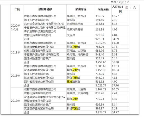 在2017-2019年度公司前五大供應商名單上,有多家鮮紅花椒企業榜上有名。2017年,漢源縣化豐堅果種植專業合作社/漢源縣治華商貿有限公司、漢源縣伊鑫商貿有限公司進入榜單,分別位于第三名和第五名,丁點兒股份分別向其采購719.23萬元、595.97萬元,在采購總額中的占比分別為6.37%、5.28%。