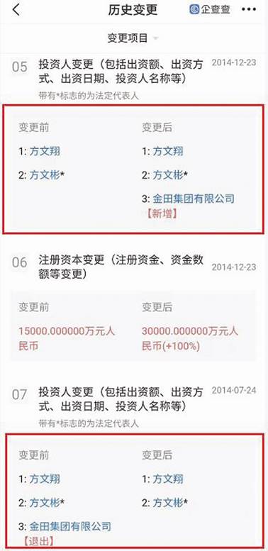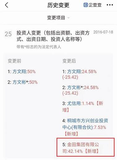 2016年7月18日,金田新材增資的同時,又發生了投資人變更,方文彬、方文翔之外,新增了3位股東,其中就有已退出的金田集團,其持股比例42.14%,系第一大股東(見圖三)。