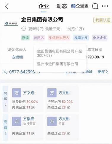值得注意的是,企查查顯示,金田集團1993年8月19日成立,彼時股東為方文彬、方文翔,方崇鈿2003年12月5日參股,后于2015年11月11日退出;之后方文彬、方文翔各自持股50%,方崇鈿為法定代表人和執行董事,方文彬擔任監事(見圖五、圖六)。根據招股書,方崇鈿系方文彬和方文翔的父親。
