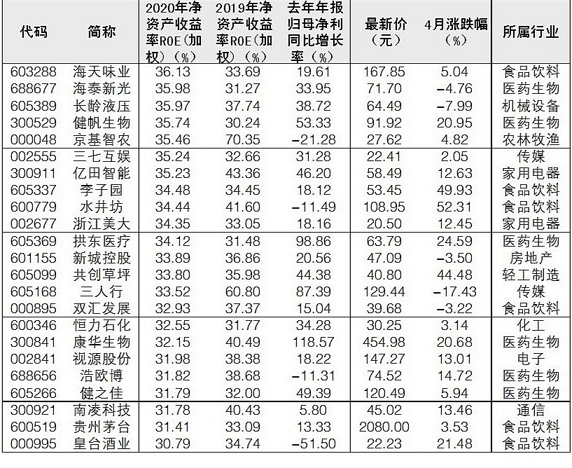 凈資產(chǎn)收益率是衡量上市公司經(jīng)營情況的重要指標(biāo),該指標(biāo)反映股東權(quán)益的收益水平,用以衡量公司運用自有資本的效率。根據(jù)Wind統(tǒng)計,截至昨日已有46股凈資產(chǎn)收益率連續(xù)于2019年、2020年度超30%。