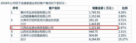 招股書顯示,酒仙網主要客戶包括線上渠道業務客戶、線下業務客戶和技術服務客戶,線下業務客戶有連鎖品牌業務客戶和流通渠道業務客戶兩大類。在2018年,江西名品酒業商貿有限公司躋身酒仙網第三大線下流通業務客戶,公司當年向其銷售1221.80萬元。該企業正是酒仙網的關聯方。