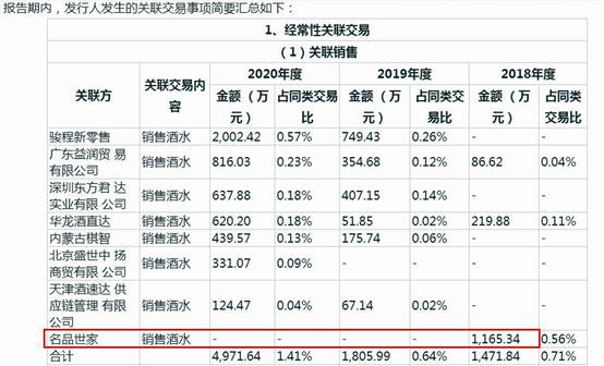 招股書中,酒仙網將名品世家及其江西名品酒業商貿有限公司列為關聯方,但披露的關聯交易中,為2018年對名品世家銷售酒水1165.34萬元,與向江西名品酒業商貿有限公司同期銷售1221.80萬元存在差異(見圖一、圖二)。兩者為何不一致以及出現不一致的原因又是否合理,成為酒仙網需要面對的疑問。