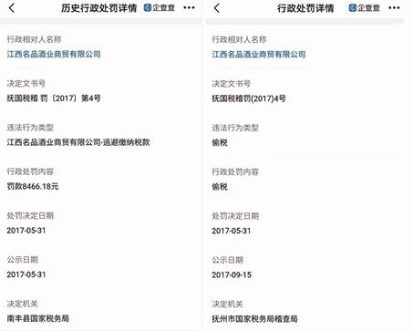 企查查還顯示,酒仙網關聯方江西名品酒業商貿有限公司在2017年因偷逃稅問題曾被稅務機關行政處罰(見圖三)。
