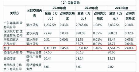 酒仙網還向廣東粵強酒業有限公司等7家關聯方進行經常性關聯采購,其中以酒水采購為主,如2018年酒水關聯采購金額高達4564.75萬元,僅向廣東粵強酒業有限公司就采購了超過3800萬元的酒水(見圖四)。雖然之后酒仙網的酒水關聯采購金額不斷下降,但到2020年仍有1310萬元出頭。