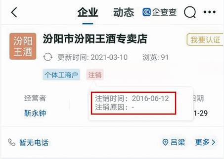 更巧的,靳永鐘注銷汾陽市汾陽王酒專賣店當日,王再武成立了同名的個體工商戶汾陽市汾陽王酒專賣店并為經營者(見圖六),而且,企查查顯示其聯系電話與靳永鐘注銷的專賣店相同。