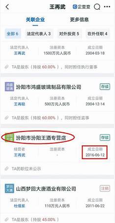 值得注意的是,企查查顯示,山西汾陽王酒業有限責任公司2004年3月成立,該企業持股60%并擔任法定代表人、執行董事的大股東王再武曾經投資企業中,也包含山西夢回大唐酒業公司,王再武彼時持股45%系第一大股東。