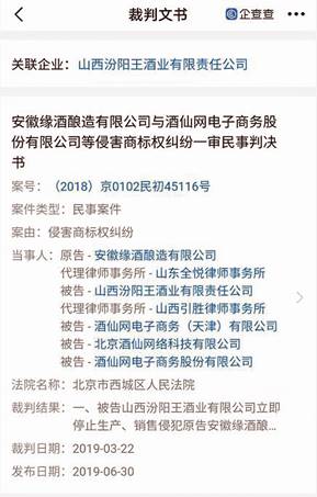 山西汾陽王酒業有限責任公司與酒仙網控股股東及公司前身,還曾是同一侵害商標權案件的被告。企查查顯示,安徽緣酒釀造有限公司2018年起訴山西汾陽王酒業有限責任公司與公司前身、公司控股股東等,法院2019年3月一審判決山西汾陽王酒業有限責任公司停止生產侵犯相關注冊商標專用權的侵權商品并賠償10萬元(見圖七)。