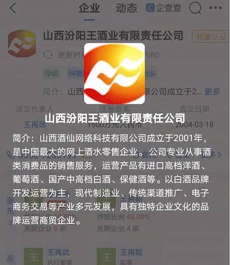然而有意思的是,企查查上的山西汾陽王酒業有限責任公司簡介為“山西酒仙網絡科技有限公司成立于2001年,是中國最大的網上酒水零售企業”等內容(見圖八)。